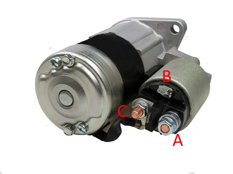 - Hou de zwarte draad weer op de motor, en doe de rode draad nu op de onderste aansluiting, hier punt C. Draai het contactslot naar de start stand. Er hoort hier nu 12V te komen. Komt dit er inderdaad op maar gaat de startmotor niet rond? Dan is de startmotor kapot. Komt er geen 12V op, dan is het startrelais kapot.